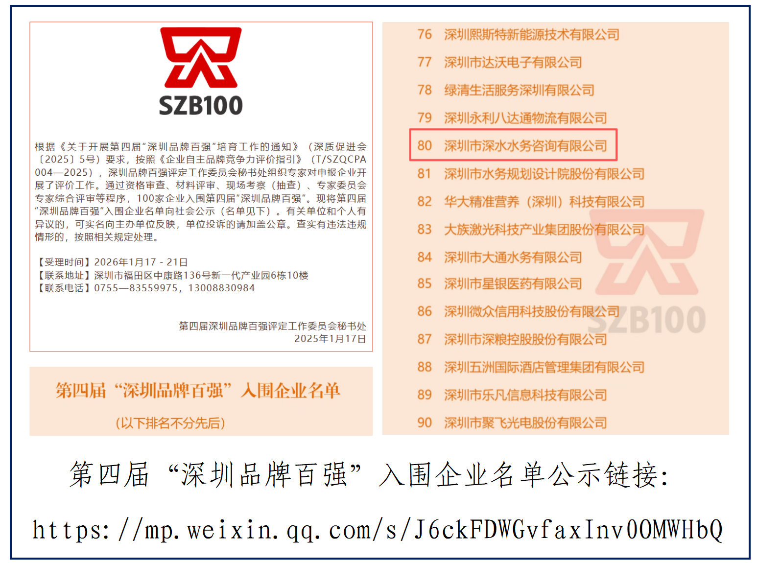 “深圳(zhèn)品牌百強”評選嚴格遵循《企業自主品牌競爭力評價指引》標準,曆經資(zī)格審查(chá)、材料評審、現場考察及(jí)專(zhuān)家綜合評審等程序,是衡量深圳(zhèn)企業品牌競爭(zhēng)力的重要標尺。連續兩屆榮登百強榜單,印證(zhèng)了深水谘詢在品牌創新驅動、質量管理及市場(chǎng)口碑的綜合(hé)優勢,是(shì)對公司堅持(chí)高質量發展、專業製勝的最佳褒獎。