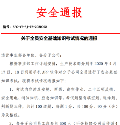 同時,在微信小(xiǎo)程序中建立培訓(xùn)考試模(mó)塊,定期組織安全培訓考試,對員工學習培訓效果進行嚴格落實。截至目前,運營事業部分別在4月、7月組織(zhī)了兩次安全考試,各分子公司員工上千(qiān)人參加了考核,合格率達90%以上。
